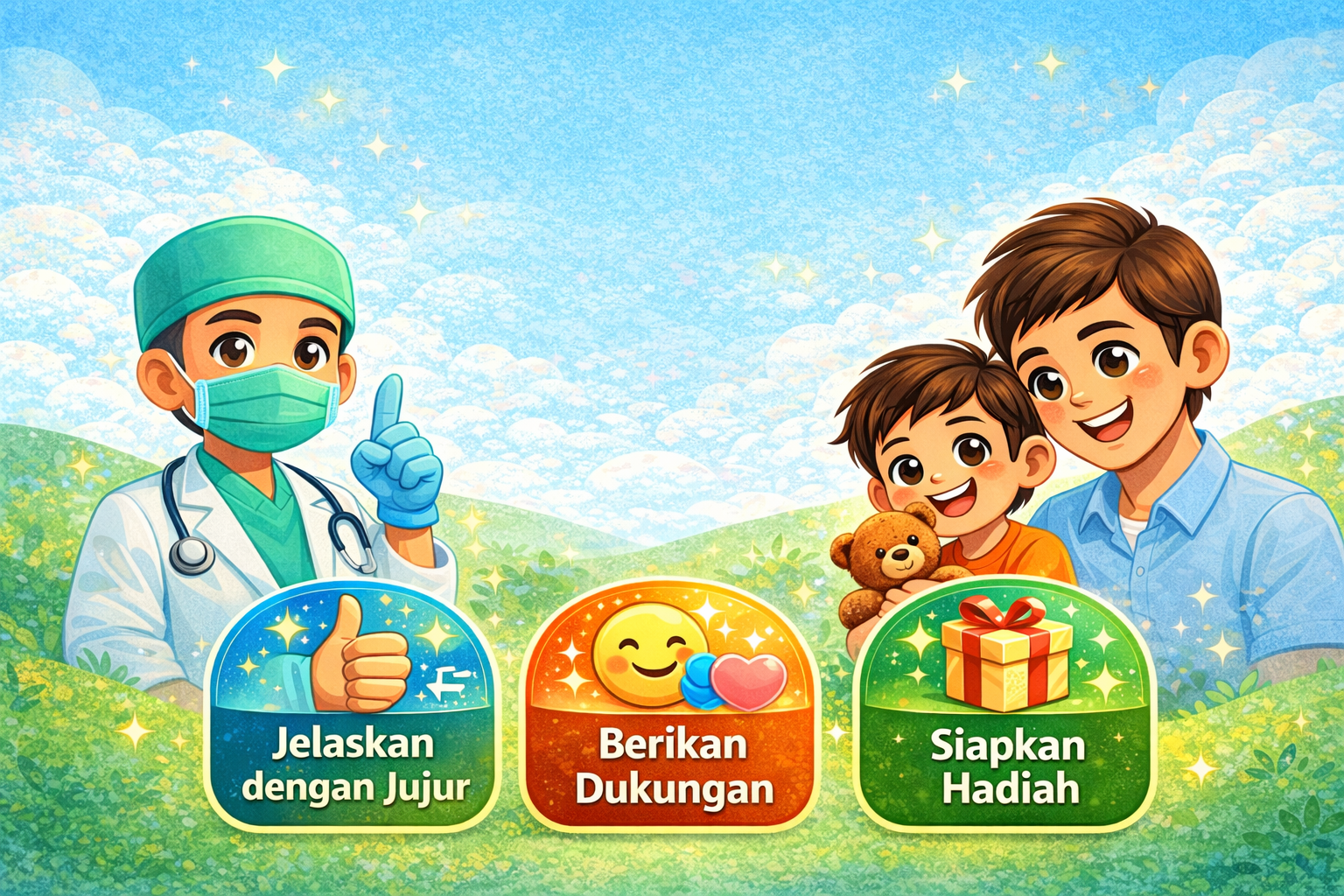 Sunat itu supaya badan jadi lebih bersih dan sehat. Nanti ada dokter yang bantu, dan Ayah/Ibu selalu menemani.